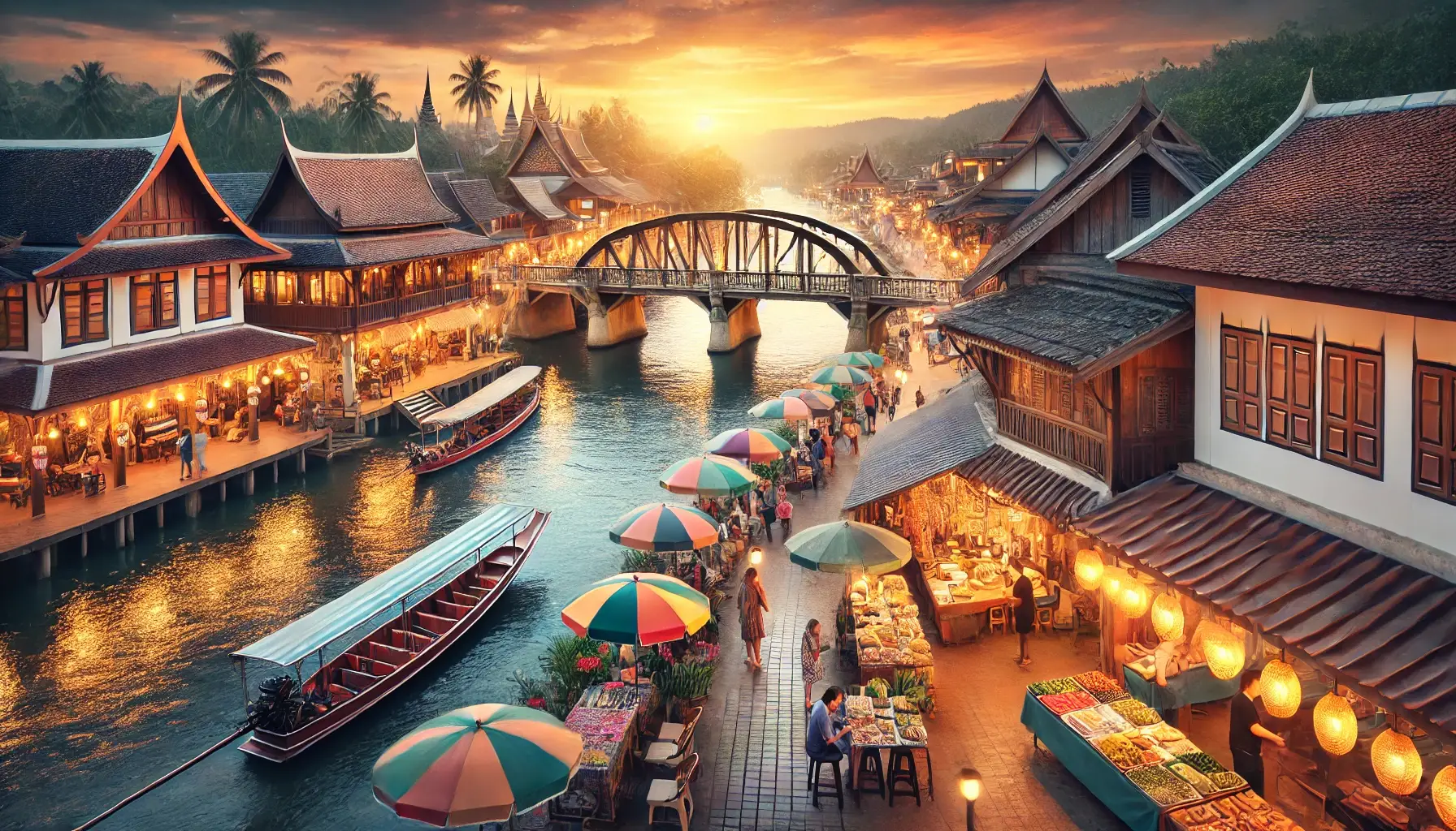 ถนนวัฒนธรรมที่เต็มไปด้วยอาคารไม้สีสันสดใสสะท้อนถึงอัตลักษณ์ท้องถิ่น มีสะพานสำคัญทอดผ่านแม่น้ำเชื่อมโยงสองฝั่งเมือง บรรยากาศในภาพดูอบอุ่นและน่าหลงใหล นักท่องเที่ยวและชาวบ้านเดินเที่ยวเล่น ชิมอาหารพื้นเมือง และสัมผัสกลิ่นอายของวัฒนธรรม