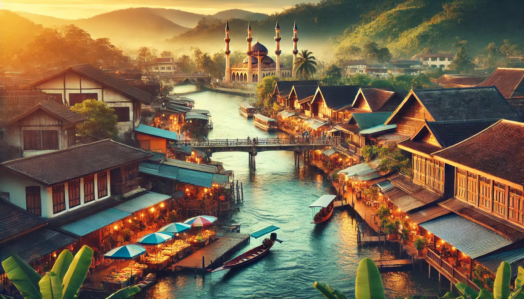 บรรยากาศริมแม่น้ำของอำเภอสุไหงโกลก จังหวัดนราธิวาส ที่เต็มไปด้วยเสน่ห์ของสถาปัตยกรรมไทยผสมผสานกับวิถีชีวิตท้องถิ่น ด้านหน้ามีตลาดที่มีพ่อค้าแม่ค้าขายของพื้นเมือง ส่วนด้านหลังมีมัสยิดโดดเด่นเป็นเอกลักษณ์ บรรยากาศโดยรวมให้ความรู้สึกถึงวัฒนธรรมที่หลากหลายและความเป็นกันเองของชุมชน